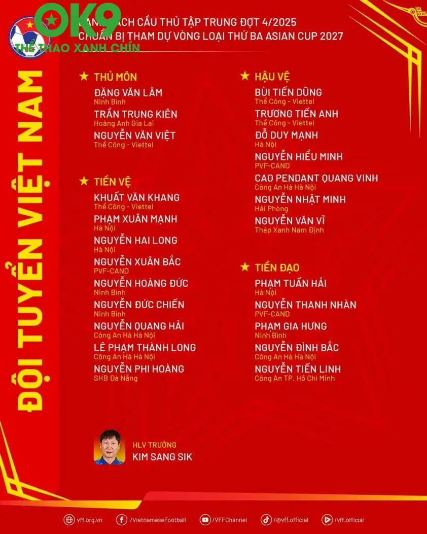 Chào anh em cược thủ! OK9 – nhà cái thể thao uy tín hàng đầu xin được mang đến những thông tin nóng hổi nhất về đội tuyển quốc gia Việt Nam trong giai đoạn chuyển giao thế hệ đầy thú vị dưới thời HLV Kim Sang Sik. Liệu những măng non của bóng đá Việt có đủ sức bật để tạo nên những bất ngờ tại vòng loại Asian Cup 2027? Hãy cùng OK9 phân tích và mổ xẻ nhé!